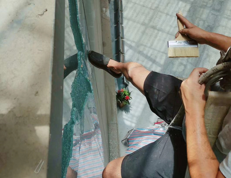 第三步:玻璃運(yùn)到施工現(xiàn)場后,工人現(xiàn)場乘坐吊籃現(xiàn)場安裝施工。最后施工完成。